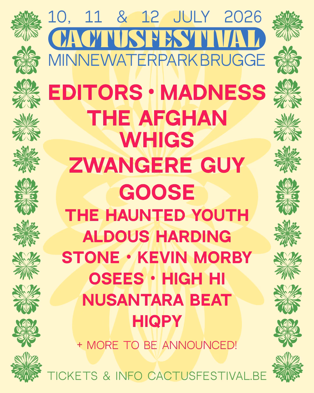 Heeft GOOSE nog een introductie nodig? De Kortrijkse electrorockformatie is al jaren een graag geziene gast in het Minnewaterpark, waar ze steevast zorgen voor aardbevingen en volkstoelopen. Met knallers als het ultieme anthem ‘Synrise’ en klassiekers als ‘British Mode’, ‘Call Me’ en ‘Words’ hoeft niemand GOOSE nog uit te leggen hoe je een festivalweide of arena compleet op z’n kop zet. Op dit moment sleutelt GOOSE in hun Kortrijkse Safari Studios aan hun zesde album, maar speciaal voor de fans verlaat de band de studio om te doen waar ze het allerbeste in zijn: een gigantisch feest ontketenen. Op Cactusfestival zetten ze het feestje dat Madness op gang trekt genadeloos verder, met een dijk van een aftershow — voor het eerst als afsluiter!