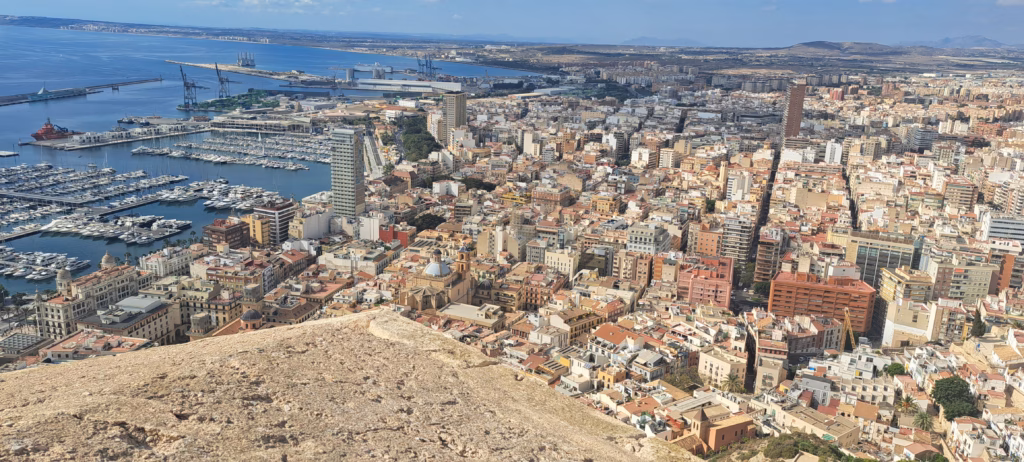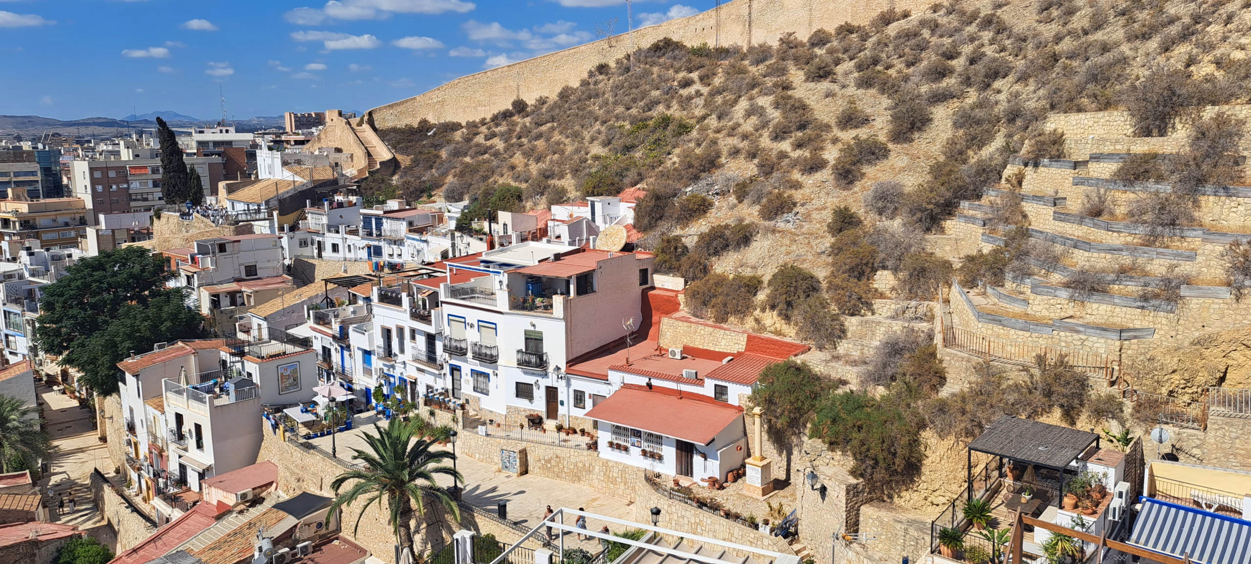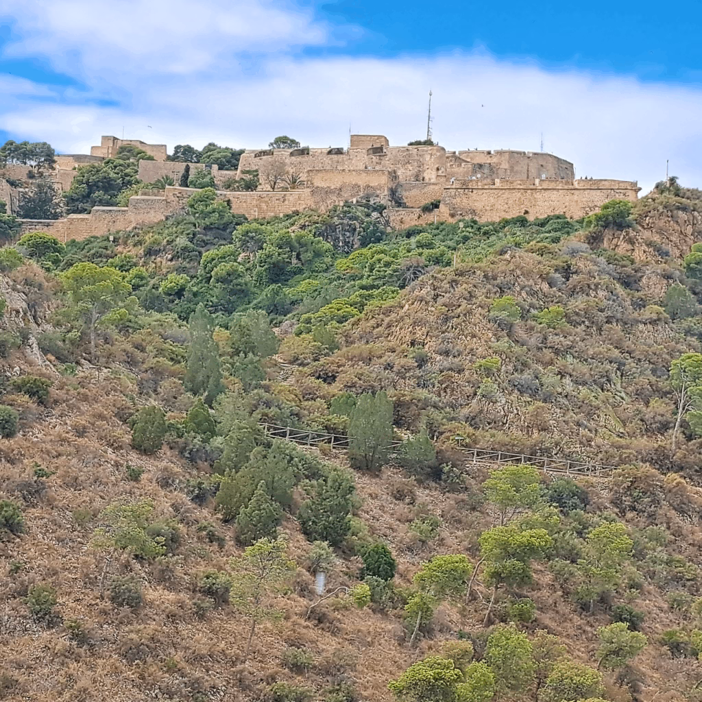Vanuit vele plaatsen in de stad zie je het Castillo de Santa Babara boven op een rots van de Monte de Benacantil. We nemen de lift naar boven en komen in een van de gebouwen waar de geschiedenis van het fort verteld wordt aan de hand van hier gevonden objecten. Sinds de oudheid hebben op deze strategische plek meerdere citadellen gestaan. Zo werd in de 18de eeuw het fort van de moslims omgebouwd tot een citadel. We stappen verder over een rotsachtig pad tot helemaal boven waar je op enkele plaatsen een schitterend panorama krijgt van de zee over de stad tot de bergen.