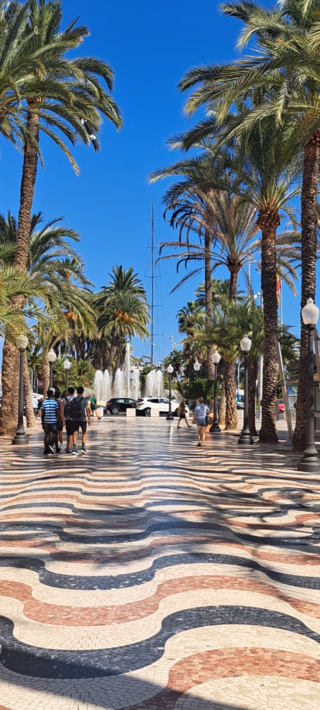 Vanuit ons hotel Maya kunnen we te voet via de strandpromenade naar het centrum. Maar om de stad echt te ontdekken nemen we de bus. Met een tienrittenkaart zijn de verplaatsingen een stuk goedkoper dan in ons land. Zo komen we al vlug aan de Esplanada de España, het uithangbord van Alicante. Deze promenade van 600 meter parallel aan de jachthaven is omzoomd met weelderige palmen en is ingelegd met ontelbaar vele marmeren mozaïektegels in rood, blauw en wit en dit in een golvend patroon.