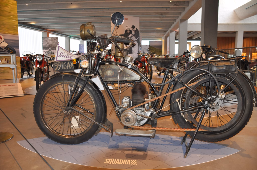 De Gillet 350cc, het oudste exemplaar op de tentoonstelling Uit 1925 ( dus 101 jaar oud). Een motor met drijfriem speciaal gemaakt voor vrouwen en geestelijken. De bovenste stang was verwijderd, een stang die losse kledij in de weg zat. Hierdoor een motor met open frame ideaal voor pastoors in soutane en dames in jurk.