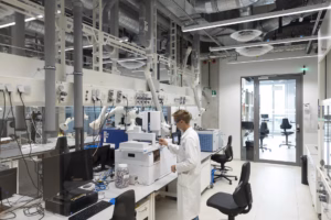 Dus werd een gloednieuw gebouw met state-of-the-artlabo’s opgetrokken. De focus van het onderzoek in Gebouw W ligt op het verduurzamen van chemie. Daarbij komt heel wat experimenteel onderzoek kijken. Voor het ontwerp van het gebouw was veiligheid dan ook prioritair. “Op elke verdieping ligt het labo centraal, volledig gescheiden van de kantoren,” vertelt Herman Van Looveren, domeincoördinator bij het Departement Infrastructuur. “De glazen wanden zorgen ervoor dat je vanop een veilige afstand zicht hebt op wat er in het labo gebeurt. Dat is essentieel als je werkt met toxische gassen zoals CO.”
