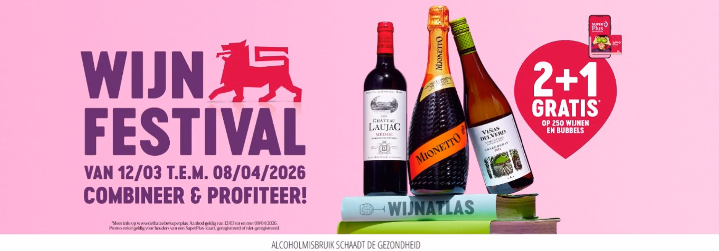De nieuwe editie van het Wijnfestival loopt van 12 maart tot 8 april, een week langer dan normaal omdat het evenement dit jaar wordt gecombineerd met de Paasactie. Klanten kunnen tijdens de actie rekenen op een uitgebreid aanbod van meer dan 250 wijnen, bubbels en alcoholvrije alternatieven, aangevuld met 2+1 Pick & Mix‑promoties voor SuperPlus‑gebruikers en twee 1+1‑aanbiedingen per week. Delhaize lanceert tegelijk een vernieuwde festivalbrochure met de tien favoriete referenties van haar wijnexperten, diverse innovaties en een reeks bijzondere wijnstreken die uitnodigt tot ontdekking.