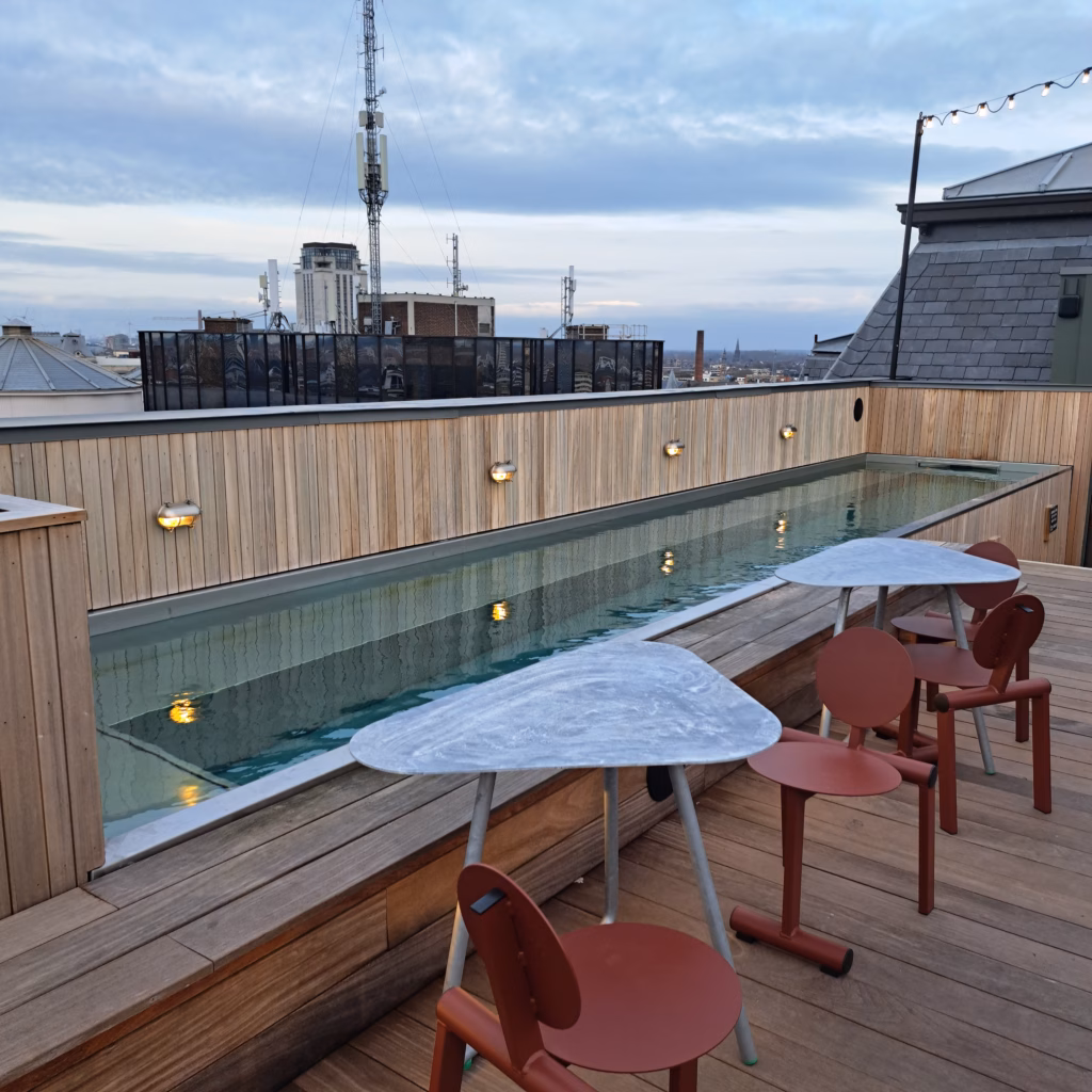 Van hieruit heb je een mooi uitzicht over de vernieuwde site van het Leopoldskwartier en de nabije omgeving met het Citadelpark, de Sint-Pieterskerk en de Boekentoren. Bij helder weer zie je aan weerszijden van het terras de hele stad! Heel bijzonder aan dit hotel is de sfeer van ongedwongenheid waarbij iedereen welkom is.