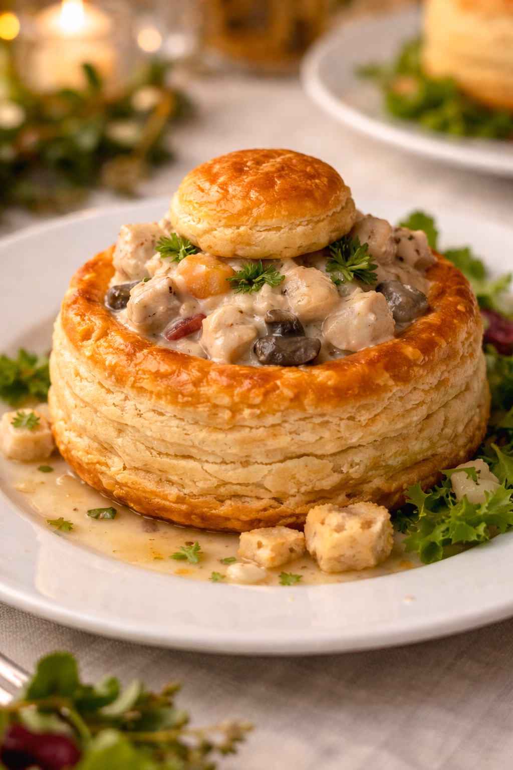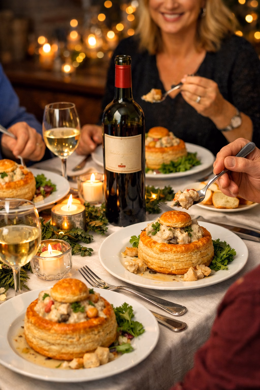 Bij een klassiek koninginnenhapje (bladerdeeg, romige kippen- of kalfsragout met champignons en soms truffel) zoek je een wijn die het botertje, de room en het delicate gevogelte aankan zonder te overheersen. Topaanbevelingen (van droog naar iets rijper):