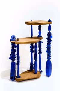 Zo lijken de kralen de vormen te overwoekeren; deels geborduurd, deels rechtstreeks op het hout gehamerd. Daarmee bevraagt De Cock wat een kraal is — of kan zijn. Hoewel ze nog steeds worden geregen tot snoeren, krijgen ze een nieuwe autonomie: ze tillen lijnen op, maken constructies mogelijk en vormen zelfs poten van sculpturale tafels en rekken. De transparantie van het glas onthult daarbij eerlijk de onderliggende constructie.