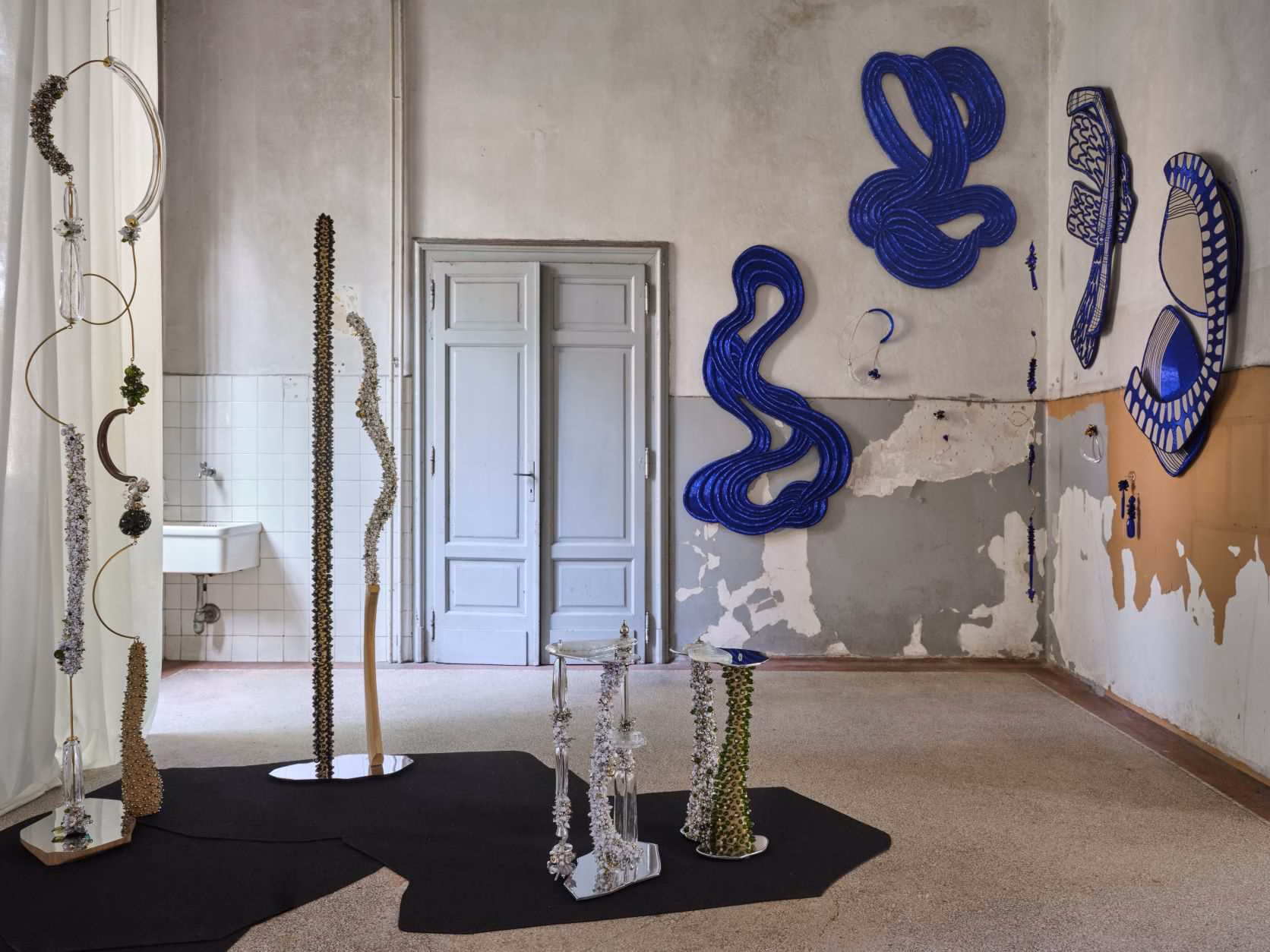 De lijn blijft daarbij een centrale rol spelen. Als hoofdpersonage beweegt ze vrij door de ruimte: zwervend, dansend en speels. Ze roept de spontaniteit van een doodle op, maar wordt steeds gedragen door een grote technische beheersing en vaak traditioneel vakmanschap. De lijnen verschijnen tegen muren, zweven tussen vloer en plafond en gaan soms een dialoog aan met dense constellaties van fijne kralen. Zo transformeert het werk de architectuur tot een betoverende, bijna intieme omgeving.