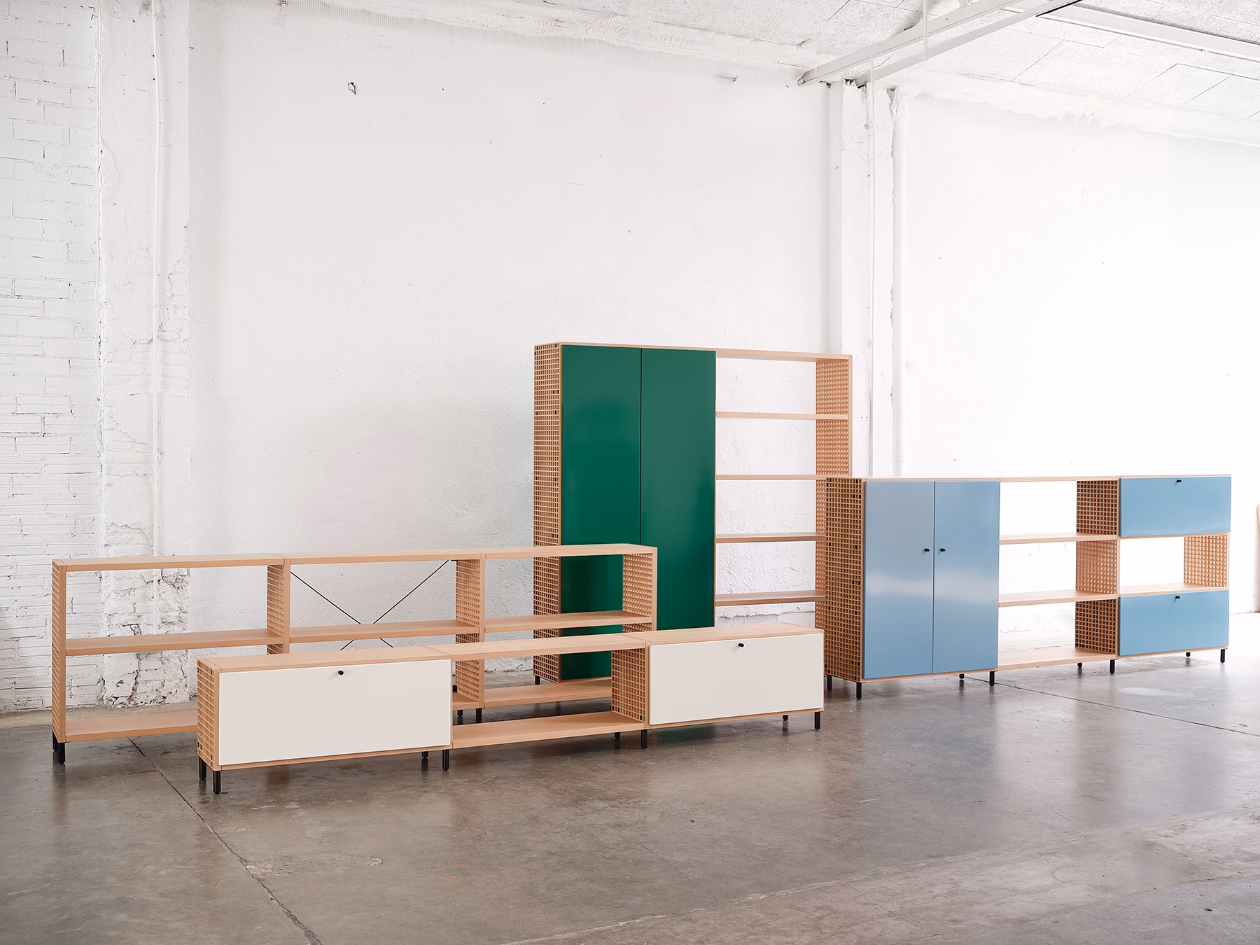 Muller Van Severen balanceert natuurlijk hout met gekleurd metaal en brengt hun kenmerkende chromatische gevoeligheid met zich mee, waardoor er stukken ontstaan die speels, licht en emotioneel innemend zijn. RASTERS is ontworpen als een modulair meubelsysteem en speelt in op de hedendaagse behoefte aan organisatie en ruimtelijke indeling. Het combineert tijdloze esthetiek met functionaliteit en duurzaamheid om zich naadloos aan te passen aan woon-, werk- en hybride kantooromgevingen. Gemaakt in Spanje.