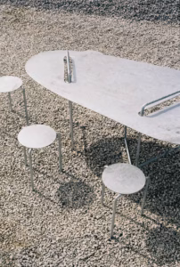 FERRATA is een buitenmeubelcollectie geïnspireerd op de Via Ferrata, de ijzeren weg in de Italiaanse Alpen. Ontwerpers Jonas Van Put en Dorien Eeckhout, beiden gepassioneerde bergsporters, vertaalden de functionele schoonheid van deze klimroutes naar sculpturale meubels. Centraal staan geplooide, thermisch verzinkte stalen U-bogen die de houvast van klimmers echoën en tegelijk grafische en tactiele elementen vormen in tafel en krukken. De organische vormen van het tafelblad en de actieve zithouding nodigen gebruikers uit zich aan te passen aan hun omgeving, zoals een klimmer zich aanpast aan het terrein en de omstandigheden.