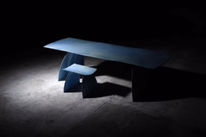 Het ontwerp van Middernacht & Alexander is een unieke tafel, gemaakt van een oude, opgegraven mazouttank die jarenlang onder de aarde verborgen lag. In plaats van het object als afval te zien, beschouwen ze het als drager van een verhaal. Het metaal, de aangekoekte teerresten en de aarde worden zorgvuldig geconserveerd en niet gecamoufleerd. Meerdere lagen epoxy brengen het rauwe materiaal tot rust, zonder het te zuiveren of te verdoezelen. Zo ontstaat een functioneel meubelstuk dat tegelijk poëtisch en betekenisvol is: elk exemplaar is handgemaakt, uniek en nodigt uit tot reflectie op transformatie, vervuiling en tijd.