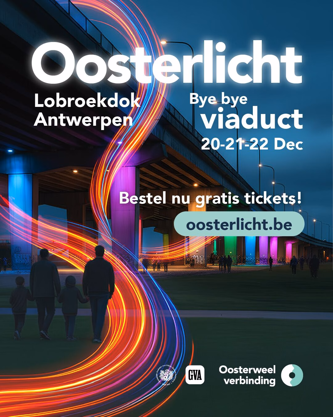 Van zaterdag 20 t.e.m. maandag 22 december tovert Lantis de Oosterweelwerf onder het viaduct drie dagen om tot een uniek licht- en geluidsparcours. Voor we afscheid nemen van het viaduct van Merksem, zetten we het nog één keer in de spotlight. Letterlijk. Tijdens “Oosterlicht” wandel je langs bijzondere projecties, gecreëerd door studenten van de Koninklijke Academie voor Schone Kunsten Antwerpen, die het viaduct een laatste keer laten schitteren. Het wordt een warme ode aan een stukje Antwerpse geschiedenis aan het Lobroekdok. Inschrijvingen starten op 22 november via http://www.oosterlicht.be