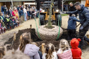 Sinds kort siert een grote groene speelzone de speelplaats van vrije basisschool ’t Kantoor in Wuustwezel. De school onthardde 500 vierkante meter speelplaats en gaf die een groene invulling: een wadi, nieuwe bomen en snoepstruiken, een bloemenweide, een faunatoren, een buitenklas, een wilgenburcht een zandkeuken en meer. Een groene speeloase van dat formaat verdient een inhuldiging van hetzelfde kaliber; de leerlingen vanaf het 3e leerjaar fietsten mee met de tractor die een grote notenboom van de plantenkwekerij naar de school vervoerde. Vervolgens werd die feestelijk op de school aangeplant en versierd.